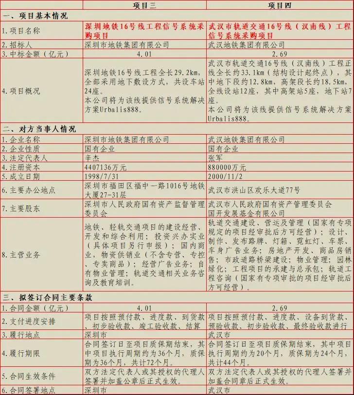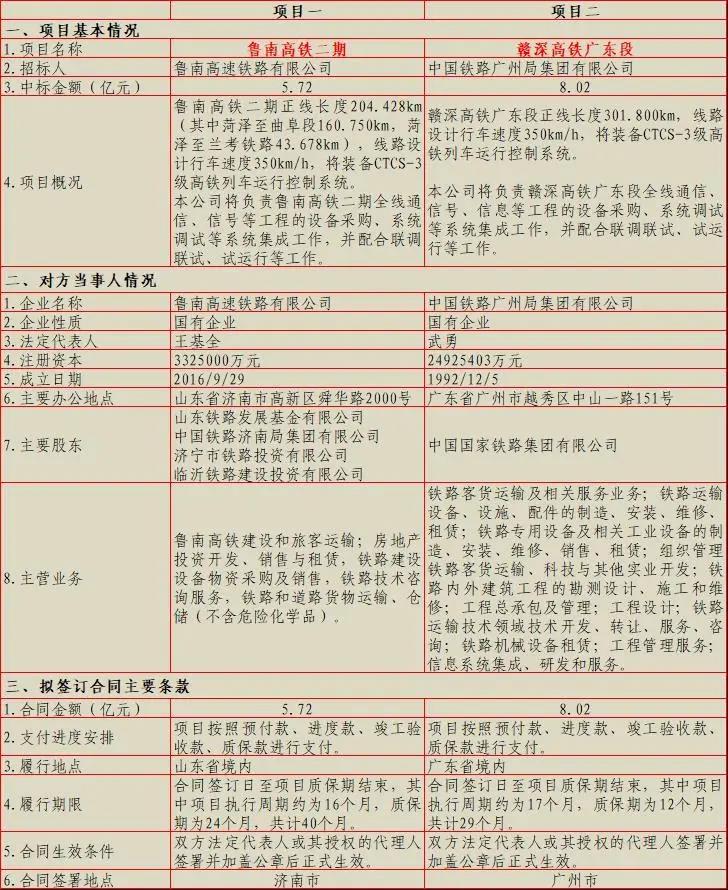 中標四個重要項目分別為新建魯南高速鐵路菏澤至曲阜段“四電”系統集成及相關工程QHSD-1標段、菏澤至蘭考鐵路(山東段)“四電”系統集成及相關工程HLSD-1標段(以下簡稱“魯南高鐵二期”),中標金額5.72億元,其中菏澤至曲阜段4.85億元,菏澤至蘭考鐵路(山東段)0.87億元;新建贛深鐵路廣東段強電、弱電集成工程GSSG-14標段(以下簡稱“贛深高鐵廣東段”),中標金額8.02億元;深圳地鐵16號線工程信號系統采購項目,中標金額4.01億元;武漢市軌道交通16號線(漢南線)工程信號系統采購項目,中標金額2.69億元。