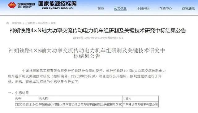 國家能源集團神朔鐵路4×N軸大功率交流傳動電力機車組研制及關(guān)鍵技術(shù)研究(招標編號:CEZB200201816)項目評標結(jié)果公示,中車株機中標。項目總工期:自合同簽訂之日起24個月。實施地點:神朔鐵路。
