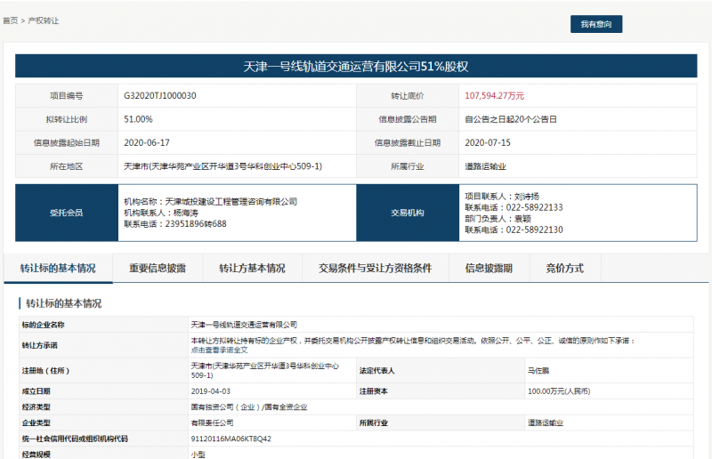 6月17日,據天交所消息,擬出讓天津一號線軌道交通運營有限公司51%股權,轉讓底價10.75億元。信息披露日期為2020年6月17日,截至日期為2020年7月15日。