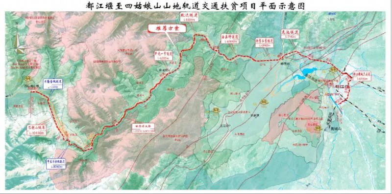 3條線路中,最長的是都江堰至四姑娘山線路,全長220.18公里,估算總投資333.7億元。其中,近期規劃的都江堰至四姑娘山山地軌道交通扶貧項目,線路長123.18公里,估算總投資197.9億元,建設工期72個月。該線路從成灌高鐵都江堰站到小金縣四姑娘山鎮,共設都江堰、永豐、蒲陽、虹口、龍池、映秀、耿達、臥龍、映雪(緩開)、鄧生溝、巴郎山、四姑娘山12個站點。遠期規劃向西延伸至小金、丹巴等縣,線路長約97公里,估算總投資135.8億元。
