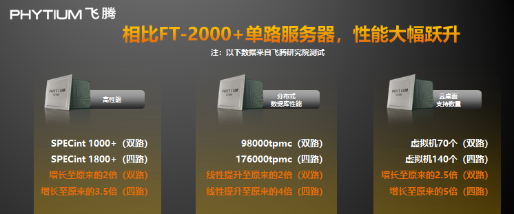 相比上一代產(chǎn)品FT-2000+單路服務(wù)器芯片,騰云S2500的性能大幅躍升。根據(jù)飛騰研究院的測試數(shù)據(jù),在整機(jī)性能方面,雙路的SPECint分值為1000+,增長至原來的2倍,四路的SPECint值為1800+,是原來的3.5倍。在分布式數(shù)據(jù)庫性能方面,雙路服務(wù)器的tpmC值達(dá)到98000,線性提升至原來的2倍,四路的tpmC值達(dá)到176000,增長至原來的4倍。在云桌面支持方面,雙路服務(wù)器支持虛擬機(jī)70個,增長至原來的2.5倍,四路服務(wù)器支持虛擬機(jī)140個,增長至原來的5倍。