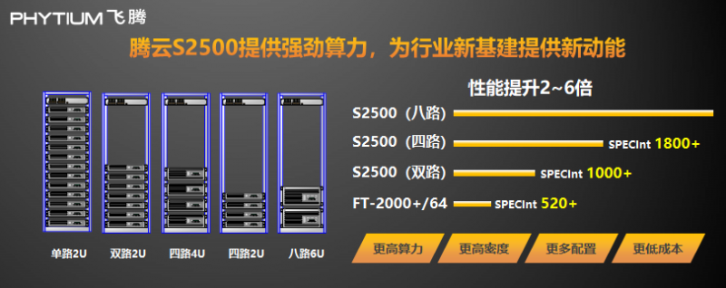 騰云S2500將為行業(yè)新基建提供更高算力、更高密度、更多配置、更低成本的解決方案。例如,一個機(jī)柜數(shù)量的FT-2000+服務(wù)器所提供的算力,僅用1/3數(shù)量的S2500四路2U服務(wù)器或1/2數(shù)量的S2500雙路2U服務(wù)器就可以實(shí)現(xiàn),系統(tǒng)建設(shè)成本進(jìn)一步壓縮。