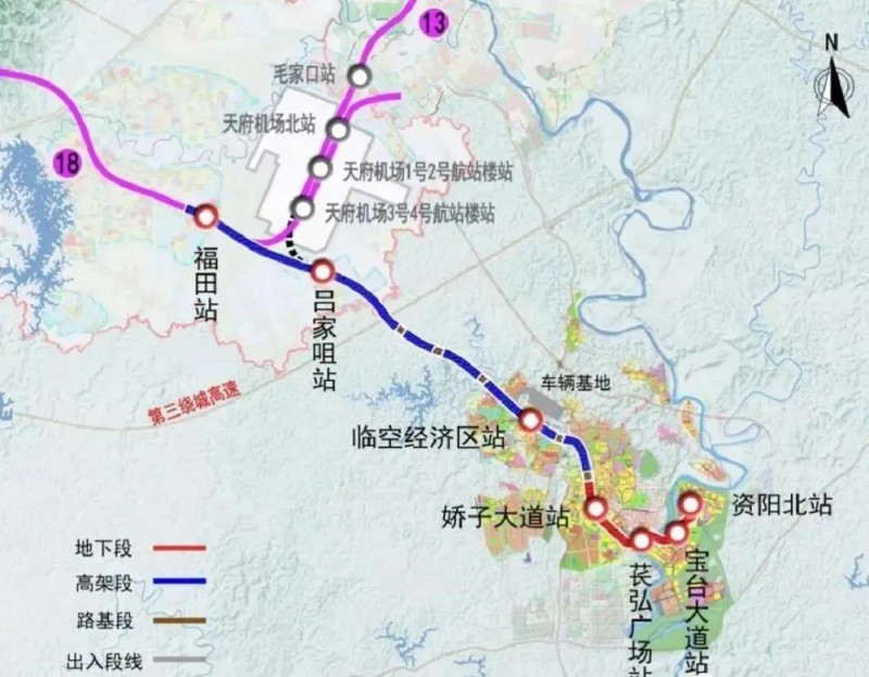 該線起于天府國際機場南側的成都軌道交通18號線福田站(機場南站),止于成渝客專資陽北站。