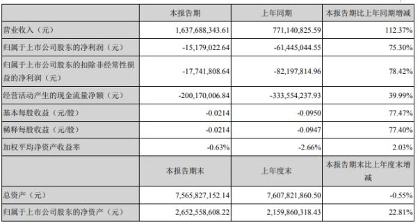 報(bào)告期末公司總資產(chǎn)為7,565,827,152.14元,較上年度末下滑0.55%;歸屬于上市公司股東的凈資產(chǎn)為2,652,558,608.22元,較上年度末增長(zhǎng)22.81%。