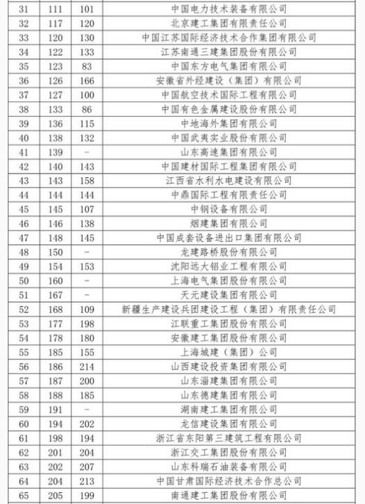 3家企業進入榜單前10強,分別是交通建設集團有限公司(排名第4位,國際營業額233.04億美元)、電力建設集團有限公司(排名第7位,國際營業額147.16億美元)、建筑股份有限公司(排名第8位,國際營業額141.43億美元);共有10家企業進入榜單50強。西班牙企業ACS以389.5億美元國際營業額排名榜首,德國企業霍克蒂芙(HOCHTIEF)以293.03億美元的國際營業額排名第2位,法國企業萬喜(VINCI)以244.99億美元的國際營業額位居第3位。