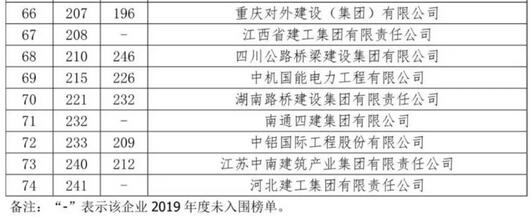 與2019年度相比,入圍今年“全球最大250家國際承包商”的74家企業中,有37家排名上升,其中上升幅度最大的為北京城建,排名從第154位上升至第105位,其次為安徽外經,排名從第166位上升至126位;27家企業排名下降;2家與2019年度排名持平;新上榜企業8家。在新上榜企業中,山東高速集團與龍建路橋表現較為亮眼,進入排名前150強,分別排名第139位和第150位。
