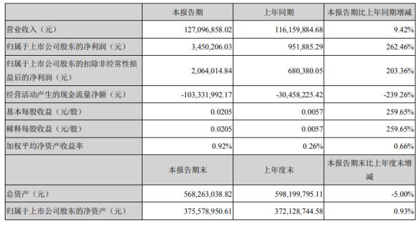 報告期末公司總資產為568,263,038.82元,較上年度末下滑5%;歸屬于上市公司股東的凈資產為375,578,950.61元,較上年度末增長0.93%。