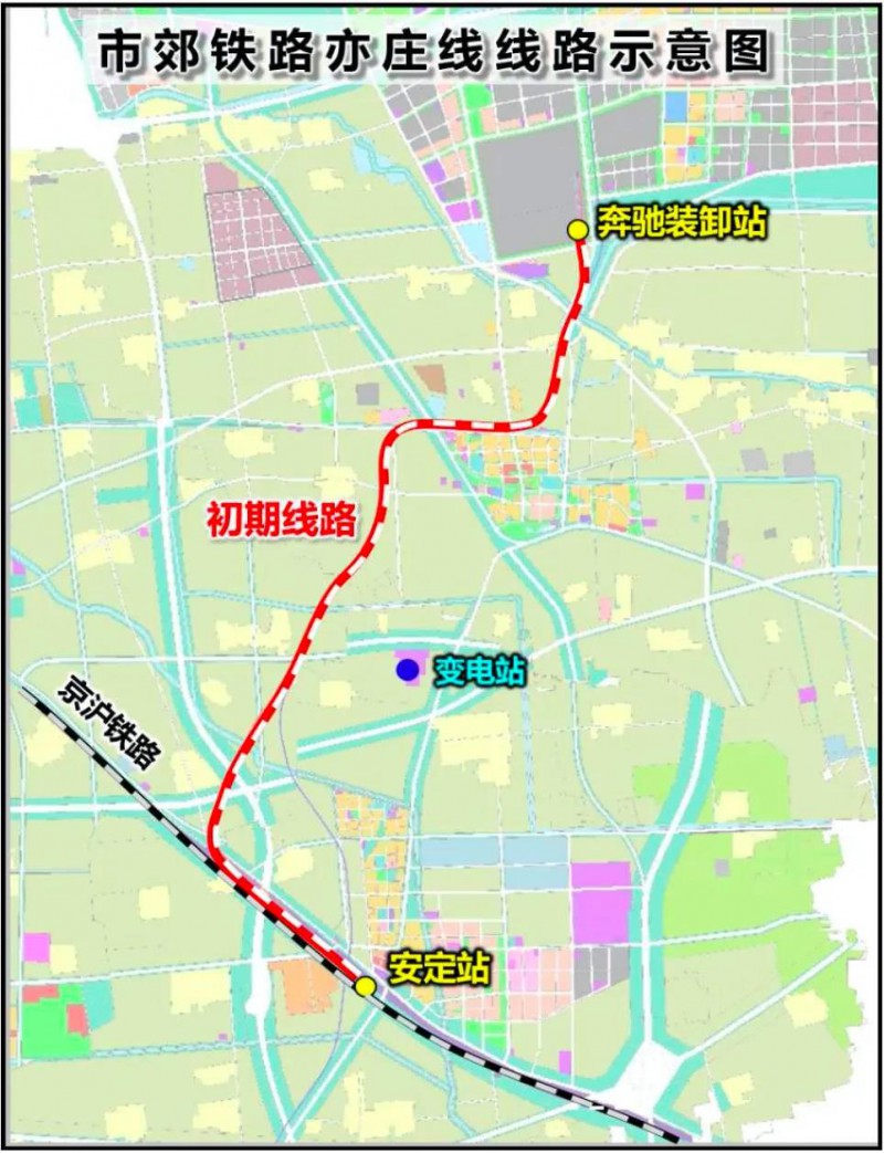 市郊鐵路亦莊線位于北京市南六環以南、大興區和北京經濟技術開發區境內。線路自既有京滬鐵路安定站北端引出,沿既有京滬線并行向西北,跨越京臺高速、黃徐路后折向東北,并在河南辛莊村東側再次跨越京臺高速,上跨大龍河后以路基形式下穿高壓線密集區,后以高架形式依次跨越岔河、青魏路、旱河和京福路,在青云店鎮區北側預留遠期設站條件后繼續向東北敷設,依次跨越青老路、青采路和鳳河后接入北京奔馳南廠區,正線線路長度12.17公里,近期設2座車站,利用既有京滬鐵路安定站,新建奔馳裝卸站,本期為貨運單線。