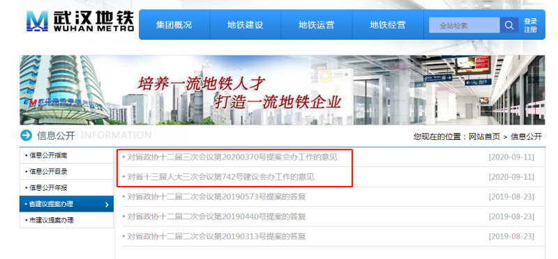 近日,武漢地鐵集團發布了《對省政協十二屆三次會議第20200370號提案會辦工作的意見》和《對省十三屆人大三次會議第742號建議會辦工作的意見》。