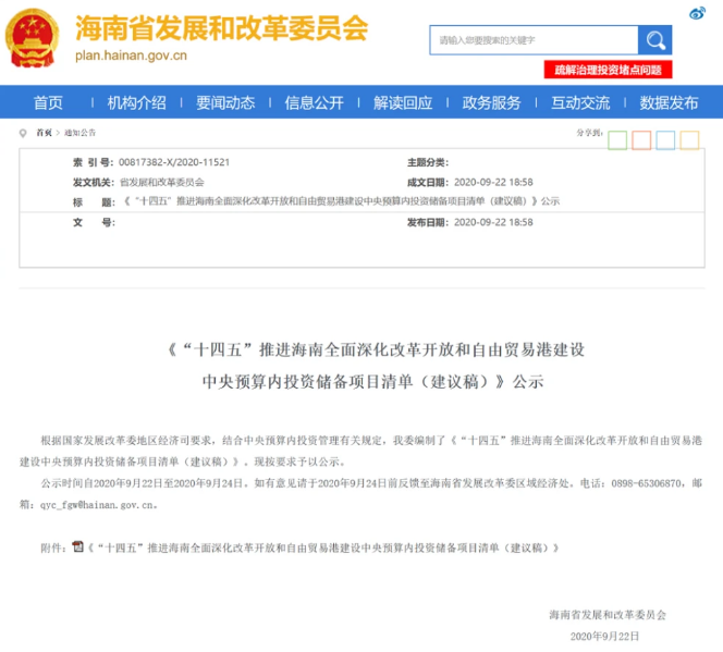 9月22日,海南發(fā)改委公布了《“十四五”推進(jìn)海南全面深化改革開放和自由貿(mào)易港建設(shè)中央預(yù)算內(nèi)投資儲(chǔ)備項(xiàng)目清單(建議稿)》。