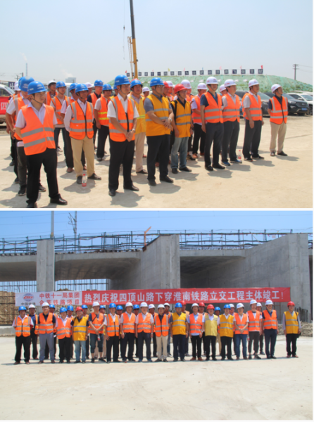 仲夏之際,地方政府、建設、設計、監理、施工等單位相關領導齊聚四頂山路施工現場,舉行簡易現場會,共同慶祝四頂山路下穿淮南線立交工程主體竣工,并對前一階段的施工進行總結,對后續工作進行了安排與部署。