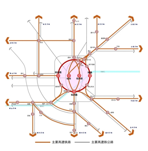 鐵路:構建以杭州東站、杭州西站、杭州站、杭州南站、錢塘站為主的“五主多輔”鐵路客運樞紐體系,形成一軸兩翼多向的大型放射型樞紐。