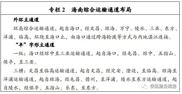 ★鐵路:規劃建設洋浦至儋州鐵路。規劃研究海口至三亞中線鐵路。研究以海口、三亞市為核心的多層次軌道交通網絡規劃方案。開展跨瓊州海峽鐵路建設方案研究。