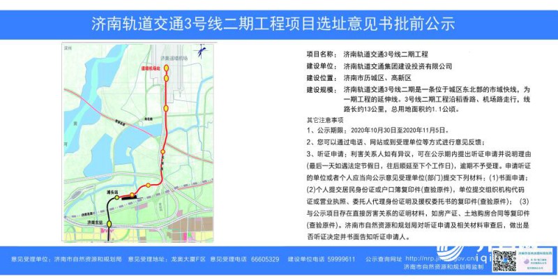 根據(jù)文件顯示,地鐵3號線二期工程是一期工程的延伸線,沿稻香路、機(jī)場路走行,全長約13公里,是一條位于城區(qū)東北部的市域快線。公示期為2020年10月30日-11月5日。
