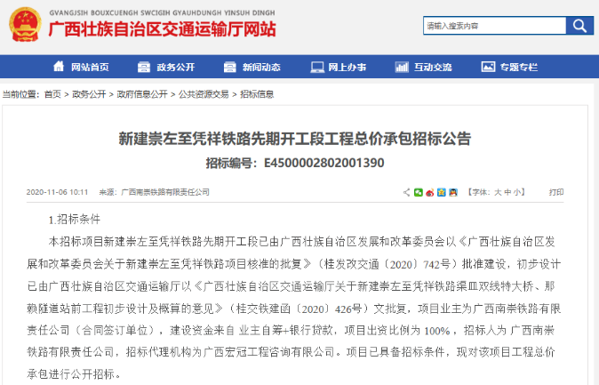 11月6日,《新建崇左至憑祥鐵路先期開工段工程總價承包招標(biāo)公告》在廣西交通運(yùn)輸廳網(wǎng)站正式發(fā)布。項(xiàng)目先期段將于年底前正式開工建設(shè),2021年全線開工,工期3.5年。