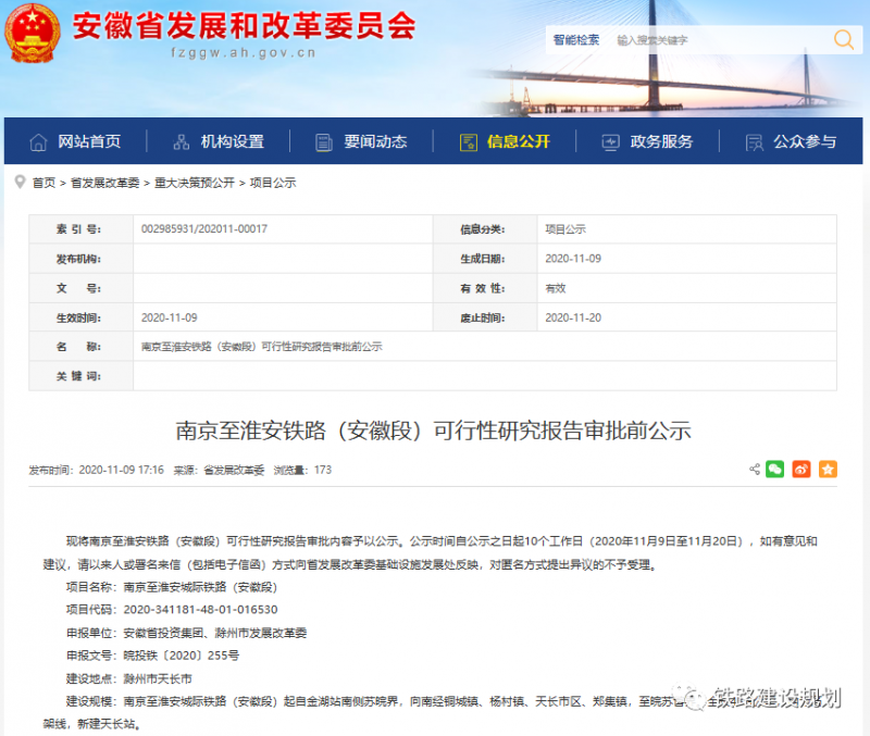 現將南京至淮安鐵路(安徽段)可行性研究報告審批內容予以公示。公示時間自公示之日起10個工作日(2020年11月9日至11月20日),如有意見和建議,請以來人或署名來信(包括電子信函)方式向省發展改革委基礎設施發展處反映,對匿名方式提出異議的不予受理。