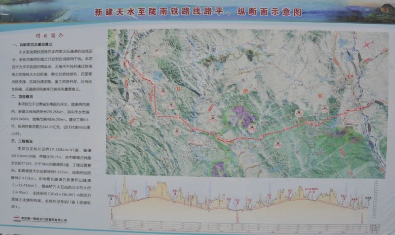 據了解,天隴鐵路總長215.258公里,其中天水市境內59.248公里,隴南市境內156.010公里,建設工期5.5年,投資估算總額為243.23億元,設計時速160公里/小時,項目正線共設橋29.558公里/42座,隧道165.804公里/29座,橋隧比90.76%,其中隧道占線路全長的77.03%,大于10公里的隧道有6座,配套修建天水站聯絡線6.623公里,隴南西站疏解線2.623公里。該項目是國家中長期鐵路網規劃和我省“十三五”鐵路發展規劃確定的重點項目,也是我省第一條全額投資、自主修建的鐵路工程。項目經天平線向東北與寶中、西平及長慶線相通,向南與蘭渝線接軌可達川渝地區,途經我省天水市的清水縣、麥積區、秦州區,隴南市的徽縣、成縣、康縣和武都區。