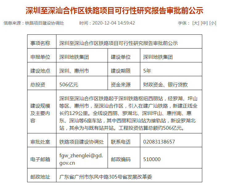 2020年7月30日,國家發改委正式批復《粵港澳大灣區(城際)鐵路建設規劃》(發改基礎[2020]1238號),深汕高鐵被列為近期建設項目。