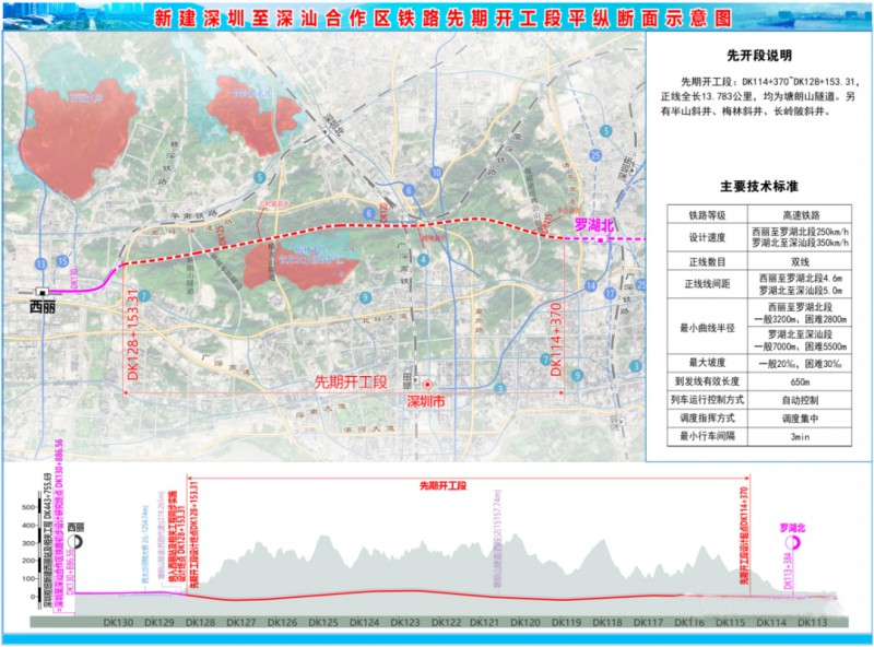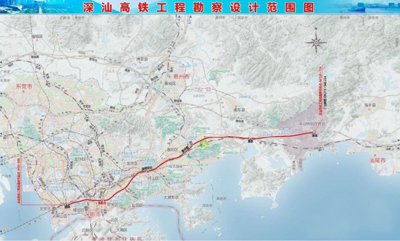 深圳至深汕合作區鐵路起于深圳鐵路樞紐西麗站,經羅湖、坪山等區、惠州市,至深汕合作區,引入在建廣汕鐵路,新建正線全長約129公里。