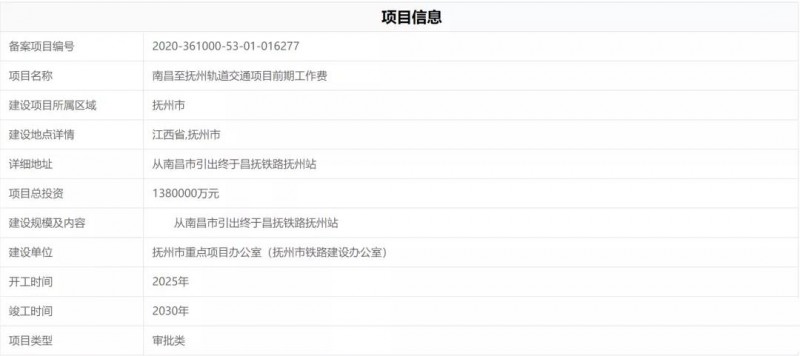 近期,江西省投資項目在線審批監(jiān)管平臺公示了一則項目的備案信息,項目名稱為南昌至撫州軌道交通項目前期工作費,建設(shè)項目所屬區(qū)域位于撫州市,建設(shè)內(nèi)容為從南昌市引出終于昌撫鐵路撫州站,項目總投資138億元。項目預(yù)計開工時間為2025年,竣工時間為2030年。該項目的主體建設(shè)單位為 撫州市重點項目辦公室(撫州市鐵路建設(shè)辦公室)。
