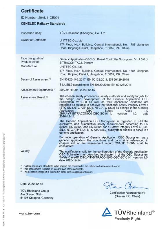 2020年12月15日,浙江眾合科技股份有限公司的BiTRACON型TACS車(chē)載OBC子系統(tǒng)通過(guò)了國(guó)際權(quán)威第三方獨(dú)立安全評(píng)估機(jī)構(gòu)德國(guó)TüV萊茵的安全評(píng)估,獲得國(guó)際最高安全完整性等級(jí)SIL4級(jí)認(rèn)證證書(shū)。