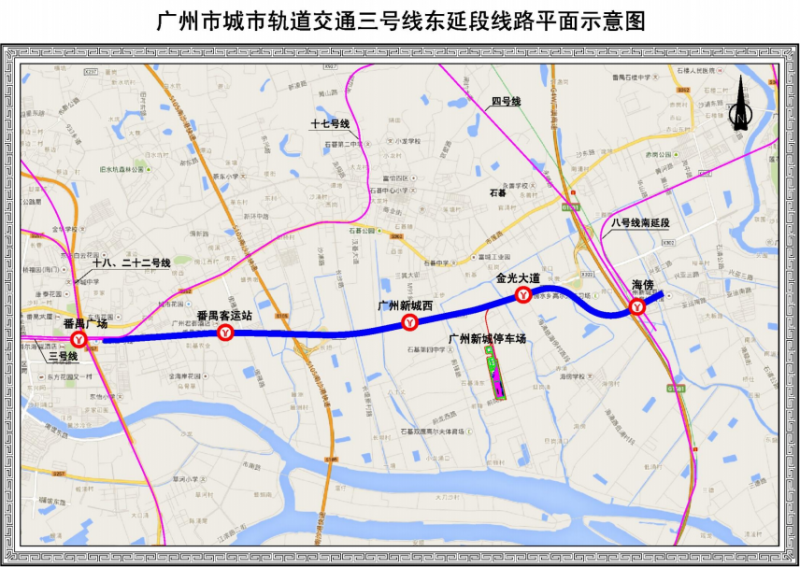 廣州市軌道交通三號線東延段工程(番禺廣場~海傍)西起已開通運營的三號線番禺廣場站,沿亞運大道(原清河東路)向東延伸,止于亞運城媒體中心南側,線路全長9.58公里,全部采用地下敷設方式,共設4座車站,其中換乘站1座,設停車場一處,為廣州新城停車場??刂浦行脑诩扔写笫刂浦行幕A上擴容;利用既有的金山主變供電。本線采用6輛編組B型車,列車最高運行速度120km/h。
