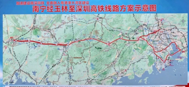 南寧經玉林至深圳高鐵是自治區全面融入粵港澳區建設一號基礎設施工程,線路全長628.8公里,近期新建南寧至江門段約529.68公里,投資909.09億元,其中,廣西段長303.53公里,投資440.47億元,廣東段長226.15公里,投資456.62億元。