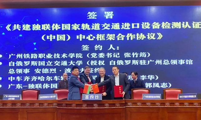 北京時間12月4日,在廣東省“一帶一路”職業教育聯盟年會上,廣州鐵路職業技術學院、白俄羅斯國立交通大學、中車齊齊哈爾車輛有限公司及廣東-獨聯體國際科技合作聯盟共同簽署了“共建獨聯體國家軌道交通進口設備檢測認證()中心框架合作協議”。合作協議旨在加深高速鐵路技術及相關服務領域內的科學合作,滿足相關行業的出口需求,并提高設備的認證效率。根據合作協議,全新成立的檢測認證中心將位于境內,并將由白俄羅斯國立交通大學的測試中心和認證機構提供基礎架構與幫助。