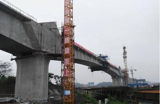 據悉,雷波寺大橋全長2470米,是內自瀘線最長的大橋。該連續梁一聯三跨, 全長257.4m,位于雷波寺右線特大橋跨成自瀘高速上空,設計為單箱單室、變 高度、變截面結構,梁高最大7m,梁寬11.2m,采用掛籃懸臂預應力混凝土澆 筑施工工藝。于2017年正式開工,系川南城際鐵路內自瀘段重大控制性工程之 一。