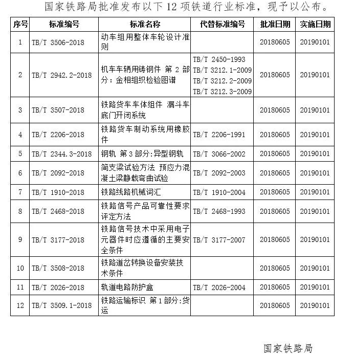 此次發布的12項標準為機車車輛、工務、通信信號、運輸專業的技術標準,主要針對動車組用整體車輪設計、鐵路信號產品可靠性要求評定、鐵路信號技術中采用電子元器件時應遵循的主要安全條件等提出了原則要求,對貨車制動系統用橡膠件、漏斗車底門開閉系統、異型鋼軌、軌道電路防護盒、鐵路道岔轉換設備安裝、簡支梁試驗、預應力混凝土梁靜載彎曲試驗等提出了技術要求、試驗方法和檢驗規則,對鐵路貨運標識、機車車輛鑄鋼件金相組織檢驗圖譜、鐵路線路機械詞匯做出了規定,標準的制修訂為產品的設計、制造、檢驗等提供了技術依據。12項標準中,新制定標準4項、修訂標準8項,自2019年1月1日起實施。