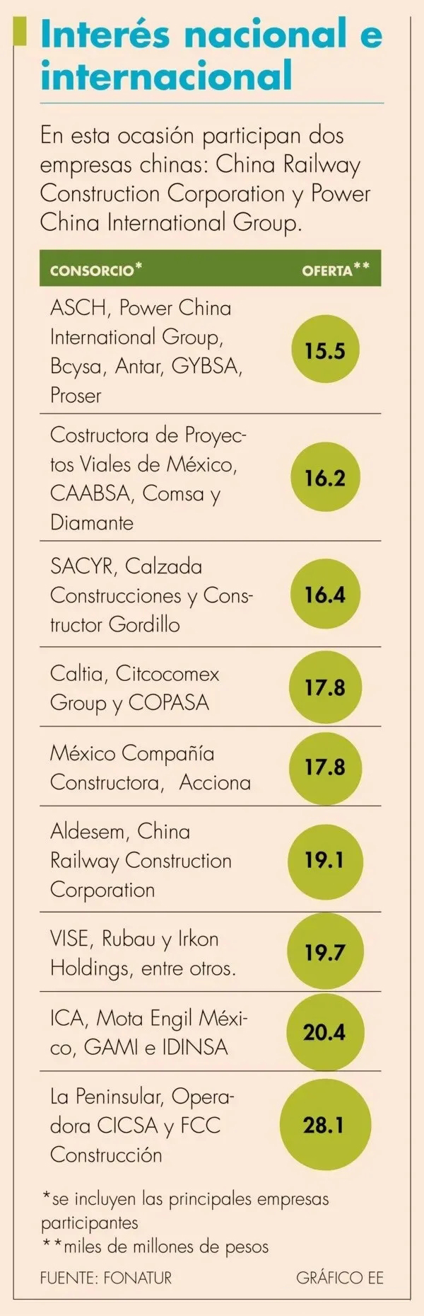 瑪雅鐵路最新動態(二)——中企參與當地時間1月16日,共有9家國際公司聯合體提供瑪雅鐵路第五標段第一部分的報價——由155.43.到281.16億比索。在參與名單中,包括第一至第四標段的中標公司。根據計劃,招標委員會將在2021年1月底宣布項目中標公司。注:共有兩家公司參與競爭,分別是中電建與中鐵建。由中電建參與的聯合體提供了項目最低報價。
