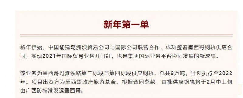 2021年1月,能建葛洲壩貿易公司與葛洲壩國際公司聯營合作,簽署墨西哥鋼軌供應合同,實現2021年國際貿易業務開門紅。項目為墨西哥瑪雅鐵路第二標段與第四標段供應鋼軌,總共9萬噸,首批供應鋼軌將于2月中上旬由廣西防城港發運墨西哥。