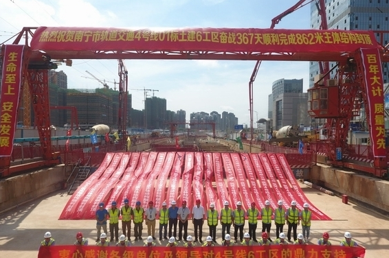 6月20日,隨著最后一方混凝土的澆筑,南寧軌道交通4號(hào)線最長深基坑——862m的飛龍路站至體育中心西站(兩站一區(qū)間)基坑主體結(jié)構(gòu)順利封頂。至此,南寧軌道交通4號(hào)線19個(gè)車站已封頂12個(gè)。