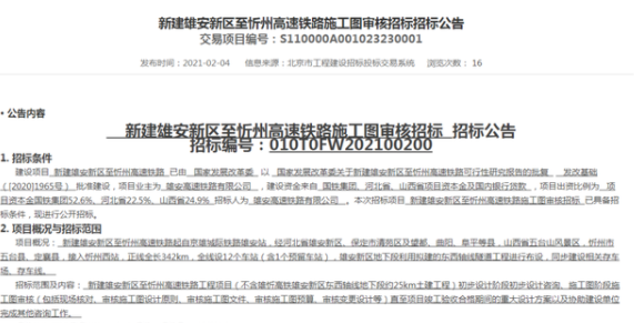 2月4日,雄安高速鐵路有限公司發布了《新建雄安新區至忻州高速鐵路施工圖審核招標招標公告》公告。招標內容為項目初步設計階段初步設計咨詢、施工圖階段施工圖審核等。