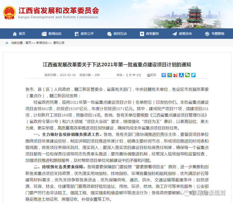 另訊:2月10日,江西省發改委發布了2021年第一批省重點建設項目計劃。本批省重點建設項目安排461項,總投資15397億元,年度計劃投資3371億元。其中,建成投產項目77項,續建項目201項,計劃新開工項目169項,預備項目14項。