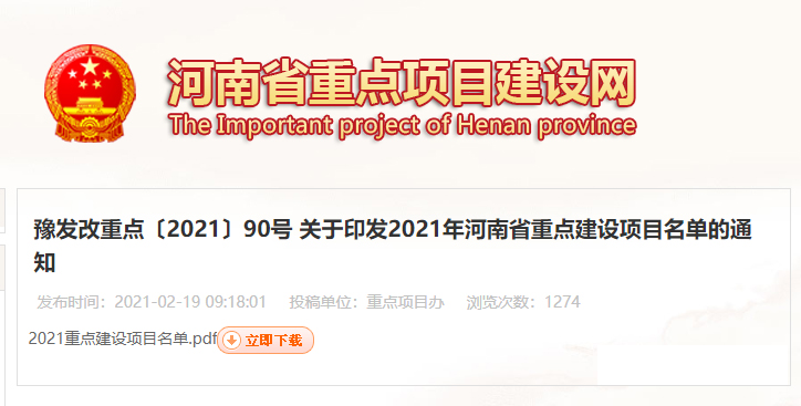 2月19日,河南省發改委以豫發改重點〔2021〕90號文發布了《關于印發2021年河南省重點建設項目名單的通知》。名單共列項目1371個,項目總投資4.4萬億元,其中2021年計劃完成投資1.1萬億元,項目數量、總投資額、年度計劃投資額均創歷史新高。