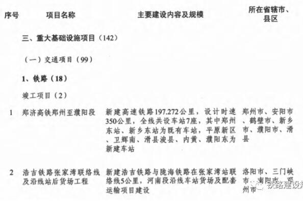 2、浩吉鐵路張家灣聯絡線及沿線站后貨場工程:新建浩吉鐵路與隴海鐵路在張家灣站聯絡線5公里,河南段沿線車站貨場及配套運輸項目建設。
