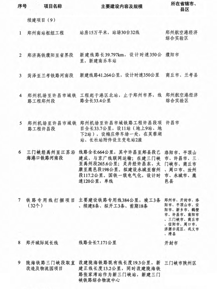 1、鄭州至濟南鐵路鄭州至濮陽段:新建高速鐵路197.272公里,設計時速350公里,全線共設車站7座,其中鄭州東站、新鄉東站為既有車站,平原新區、衛輝南、滑縣浚縣、內黃、濮陽東為新建車站。