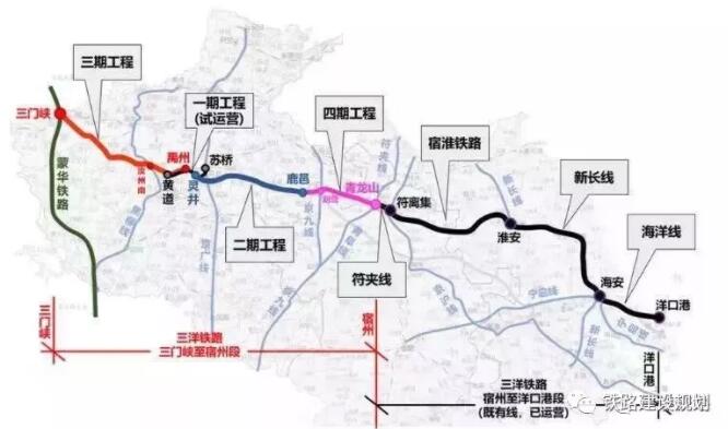 6、三門峽經禹州至江蘇沿海港口鐵路河南段:線路全長664公里,其中許昌至郟縣段已建成,與京廣線聯網運輸;在建三門峽至禹州段265.6公里;靈井經許昌東、太康至鹿邑段198公里。擬建設永城至宿州段117.2公里。國鐵一級電氣化,設計時速120公里,單線。