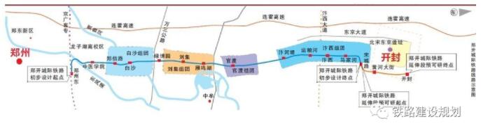 8、鄭開城際鐵路延長線:新建城際鐵路7.171公里,設計時速200公里。開封站為既有站(站房整體改建),黃河大街為預留中間站。