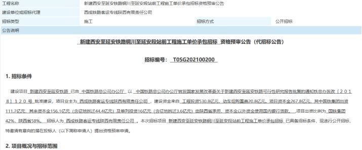 3月3日,《新建西安至延安鐵路銅川至延安段站前工程施工單價承包招標(biāo)資格預(yù)審公告》正式發(fā)布。根據(jù)招標(biāo)公告內(nèi)容,項目計劃2021年5月1日開工,2025年10月底竣工。