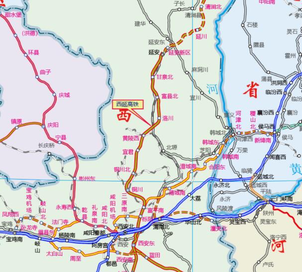 新建西安至延安高速鐵路自西安北站、西安東站引出,經(jīng)西安市高陵區(qū)、閻良區(qū),渭南市富平縣,銅川市耀州區(qū)、王益區(qū)、印臺區(qū)、宜君縣,延安市黃陵縣、洛川縣、富縣、甘泉縣和寶塔區(qū),至既有包西鐵路延安站。