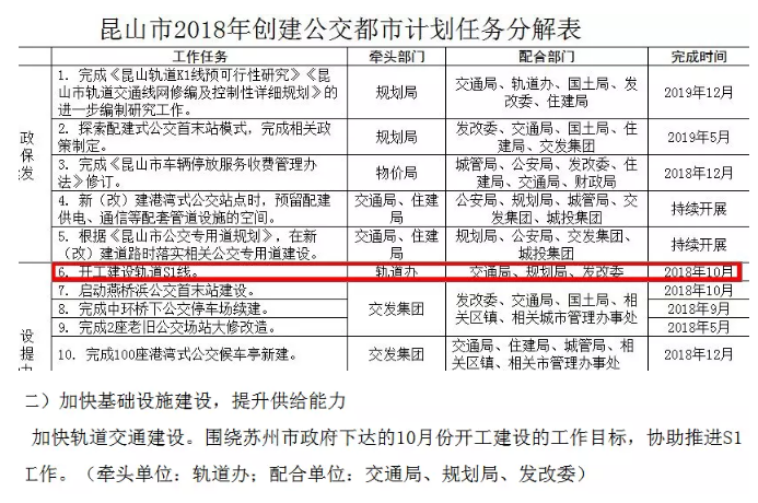 在昆山政府印發的這份通知里明確提到開工建設軌道S1線完成時間為2018年10月牽頭部門是軌道辦配合部門是交通局、規劃局、發改委。