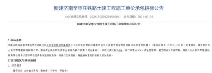 3月4日,《新建濟南至棗莊鐵路土建工程施工單價承包招標公告》正式發布。根據招標公告內容,項目計劃2021年4月1日開工,工期4年。