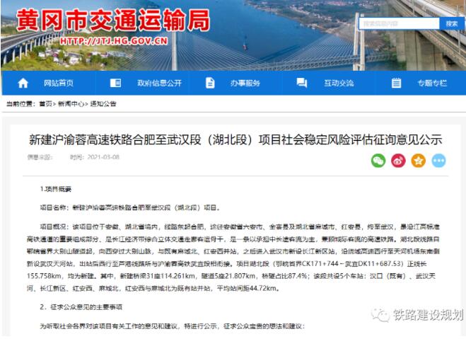 3月8日,《新建滬渝蓉高速鐵路合肥至武漢段(湖北段)項目社會穩定風險評估征詢意見公示》在黃岡市交通運輸局網站正式發布。