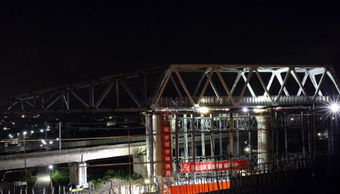 該橋?yàn)槊飞歉哞F的重要工程,斜跨廈深高鐵營運(yùn)線,跨越處位于R=800米的圓曲線上,坡度為15‰,根據(jù)設(shè)計(jì)鋼桁梁為單線簡支梁橋跨結(jié)構(gòu),全長66米,跨度64米,總重量755噸,鋼桁梁采用拖拉法施工,拖拉距離為110米,安全風(fēng)險高,施工難度大。為了確保施工作業(yè)萬無一失,中鐵六局梅汕客專項(xiàng)目部提出了方案論證到位、演練環(huán)節(jié)到位、安全保障到位、對外協(xié)調(diào)到位、施工組織到位的“五到位”管理要求,深化“安全質(zhì)量月”活動,強(qiáng)化干部員工安全生產(chǎn)意識,完善和落實(shí)安全生產(chǎn)規(guī)章制度,并多次進(jìn)行模擬演練。6月20日零時,隨著封鎖施工命令的下達(dá),作業(yè)現(xiàn)場人聲鼎沸,機(jī)器轟鳴,開始了鋼桁梁拖拉施工作業(yè)。在鐵路部門連續(xù)四天四個“天窗點(diǎn)”,中鐵六局梅汕客專項(xiàng)目部安全順利完成了鋼桁梁上跨作業(yè)。