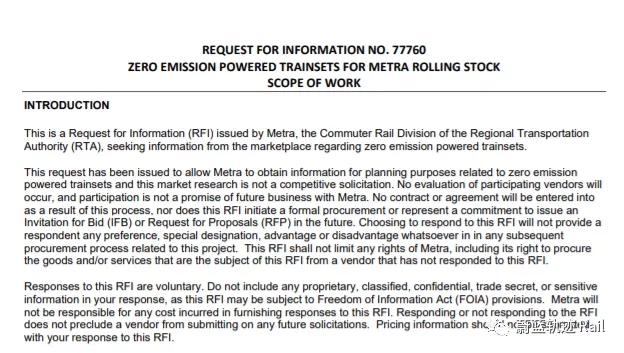 2021年2月,美國芝加哥通勤鐵路公司董事會(huì)批準(zhǔn)了一項(xiàng)計(jì)劃,將零排放鐵路車輛。當(dāng)?shù)貢r(shí)間3月19日,鐵路公司正式發(fā)布招標(biāo)信息(RFP),邀請(qǐng)列車制造商提供零排放鐵路車輛的方案。招標(biāo)截止時(shí)間:2021年4月19日 16:00(當(dāng)?shù)貢r(shí)間)