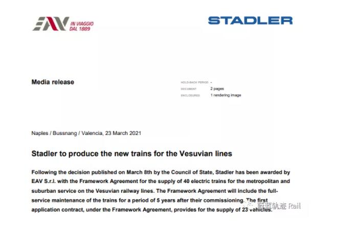 當地時間3月23日,瑞士Stadler宣布:與意大利坎帕尼亞地區鐵路高速簽訂為期8年的列車供應框架協議,將提供40列動車組。根據協議,將在第一階段提供23列新車及為期5年的維保。