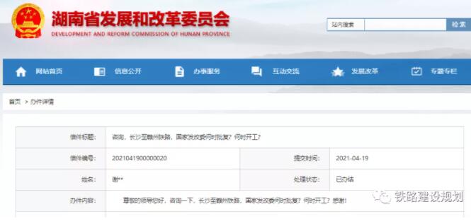 4月22日,湖南省發改委在答復網友關于長贛高鐵何時開工的問題時回復: