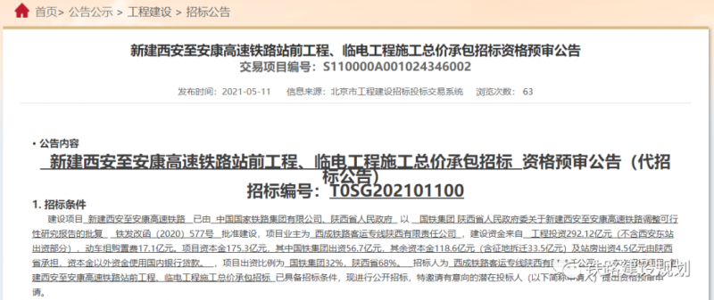 鐵路建設規劃消息:5月11日,《 新建西安至安康高速鐵路站前工程、臨電工程施工總價承包招標 資格預審公告》正式發布。
